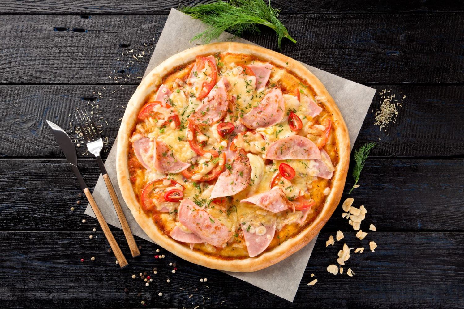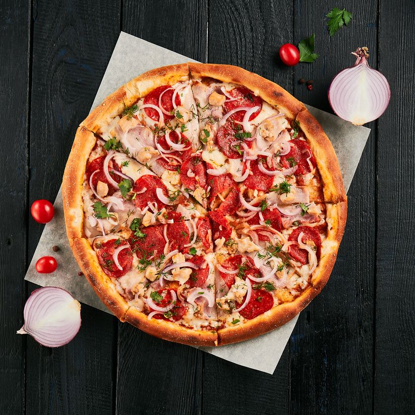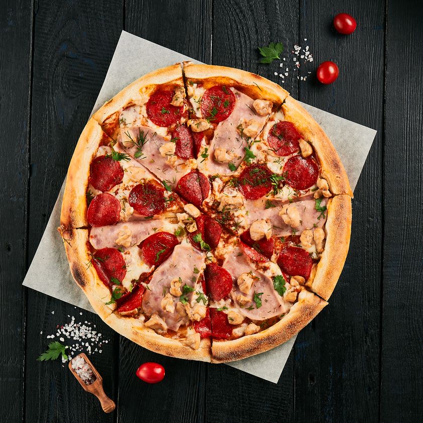 Соус томатный, ветчина, пикантная пепперони, копченная курица