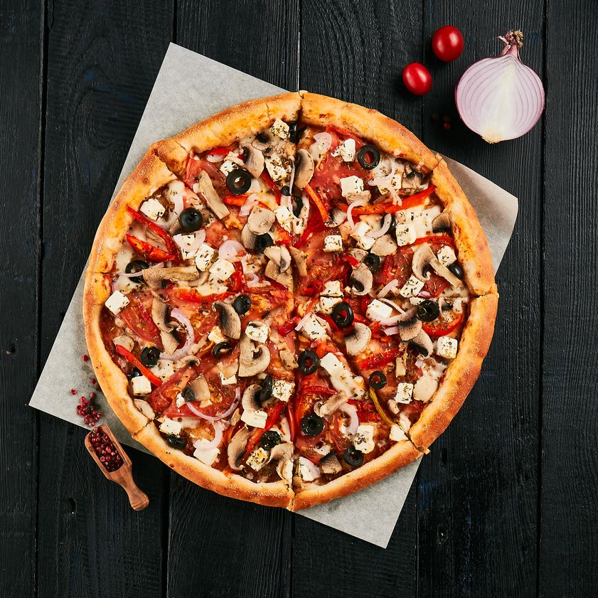 Соус томатный, шампиньоны, томаты, лук красный, маслины, кубики брынзы, сыр моцарелла