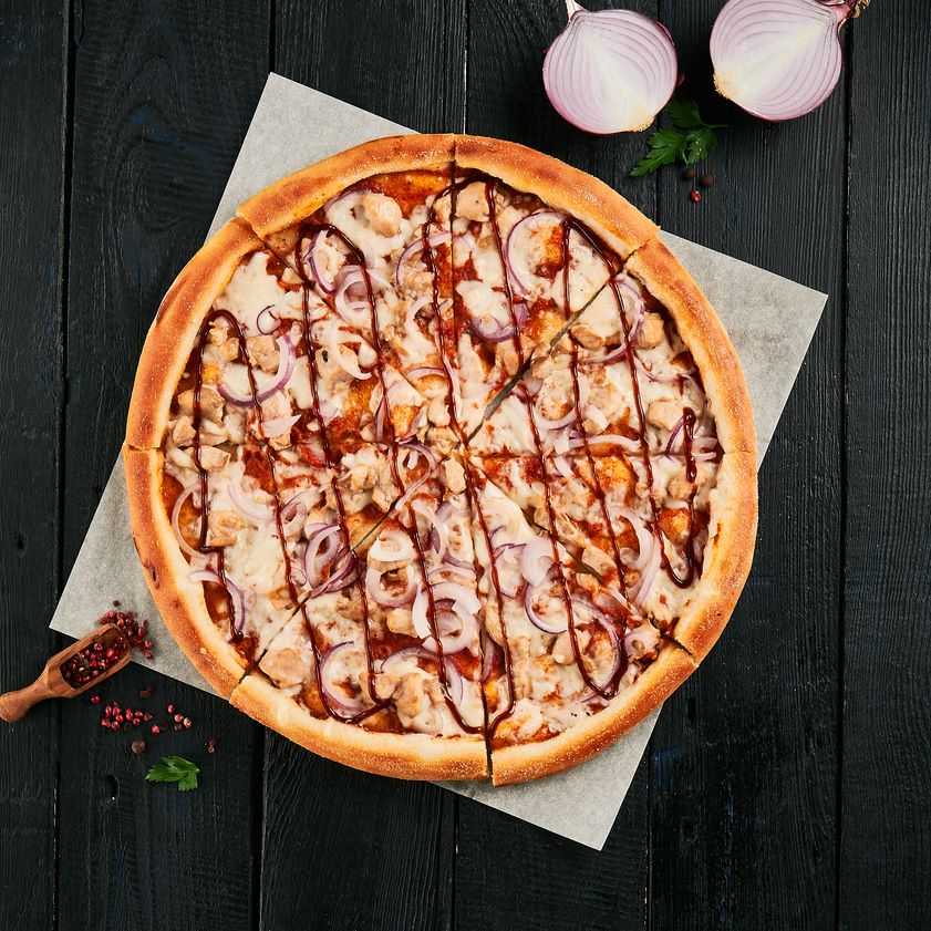 Соус томатный, копченная курица, лук красный, сыр моцарелла, соус барбекю