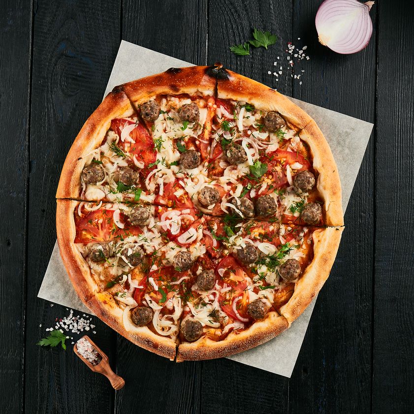 Соус томатный, фарш из говядины, лук маринованный, томаты, сыр моцарелла