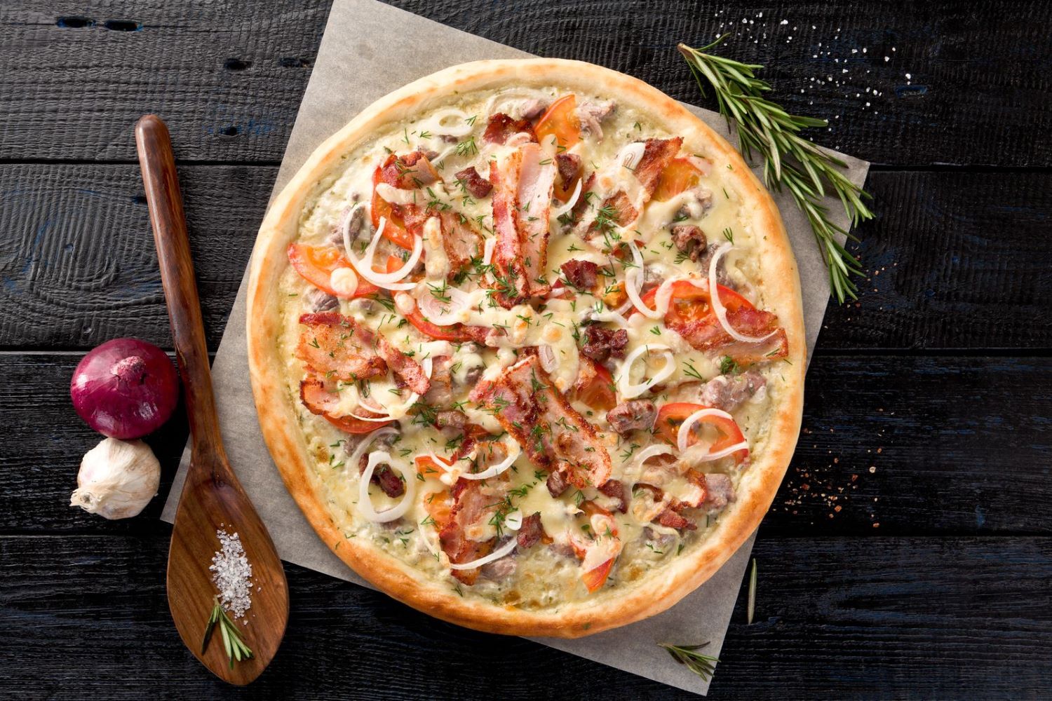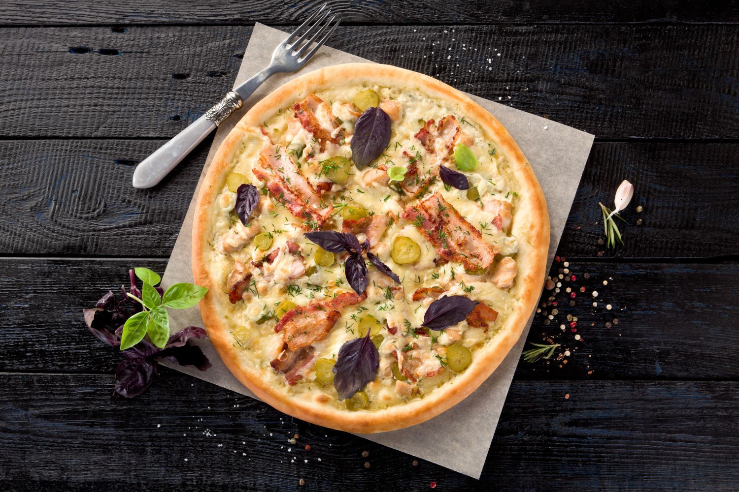 Соус тар-тар, копченная курица, бекон, томаты, сыр моцарелла