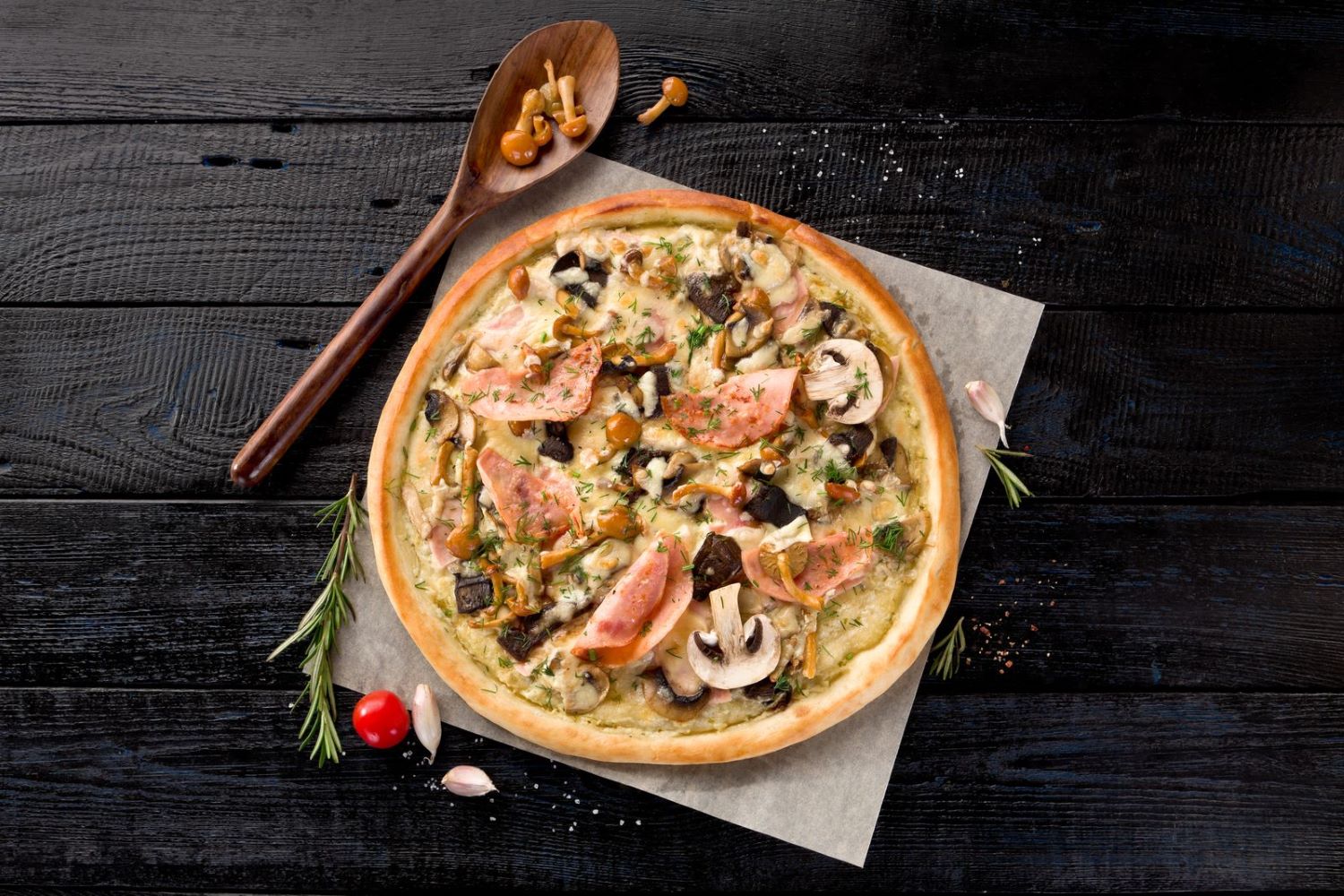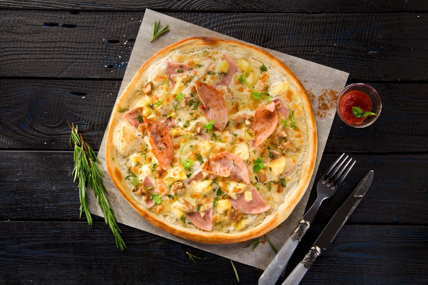 Соус сливочный, ветчина, копченная курица, ананасы, сыр моцарелла