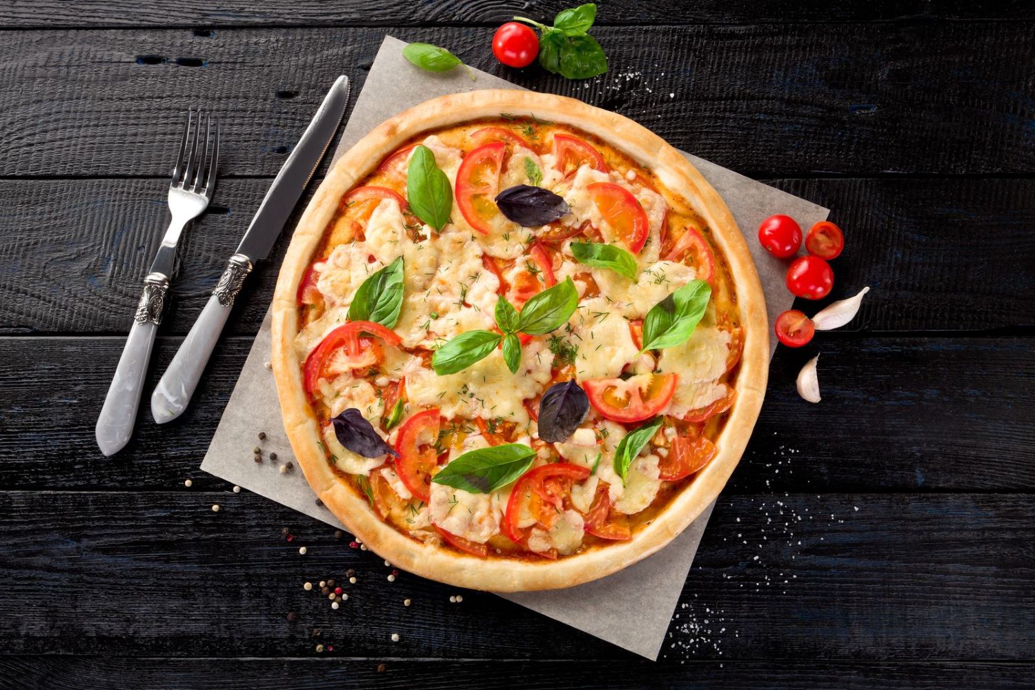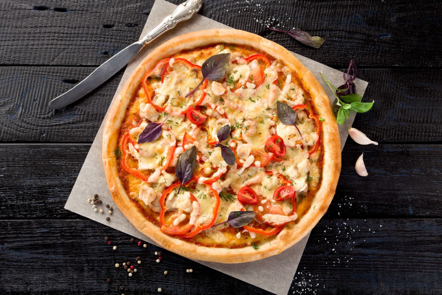 Соус сливочный, копченная курица, томаты черри, кубики брынзы, сыр моцарелла