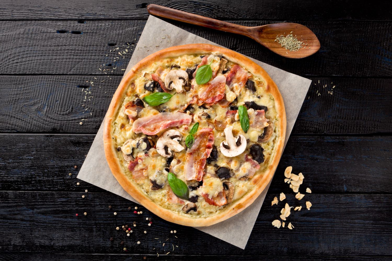 Соус томатный, бекон, пикантная пепперони, копченная курица, сыр моцарелла