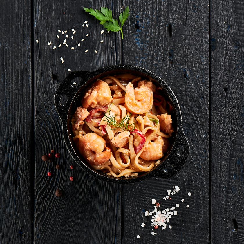 Лапша удон, лосось, креветка тигровая, мексиканская смесь, сливочный соус